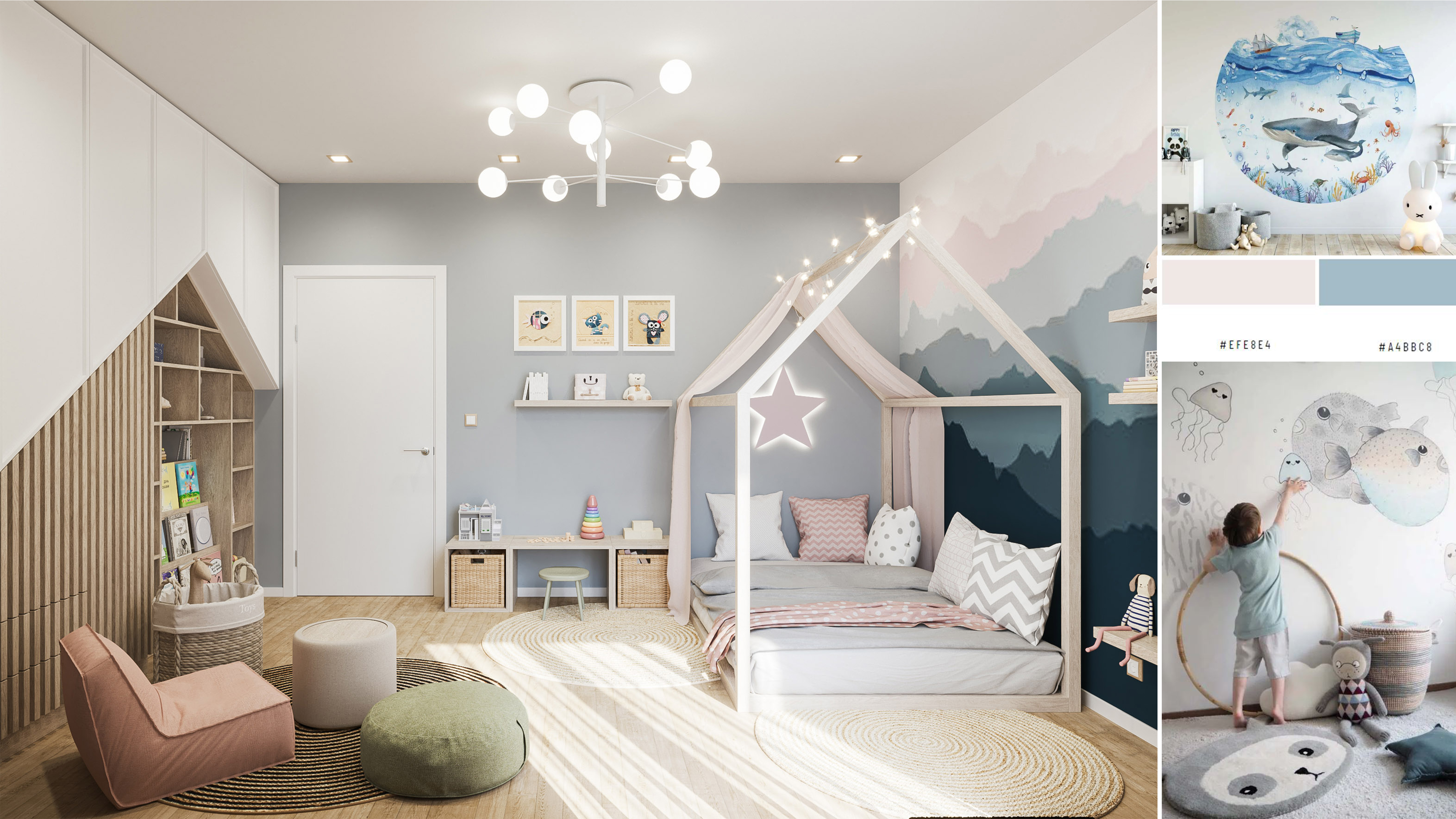 Цветовата палитра играе важна роля в дизайна на детската стая. Независимо дали ще използвате ярки и весели цветове, които стимулират въображението и създават радостна атмосфера или ще заложите на по-пастелните, натурални тонове, дяволът се крие в правилното съчетаване. Помислете за комбинацията на цветове, която е хармонична и успокояваща за вашето дете.